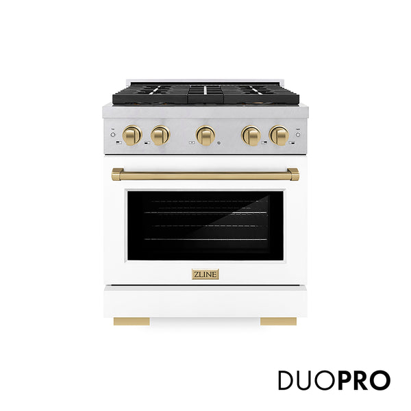 ZLINE Autograph Edition 30 in. 4.2 cu. ft. Paramount Dual Fuel Range with 4 Burner DuoPro™ Cooktop and Electric Convection Oven in Satin Stainless Steel with White Matte Door and Champagne Bronze Accents (PSDRSZ-WM-30-CB)