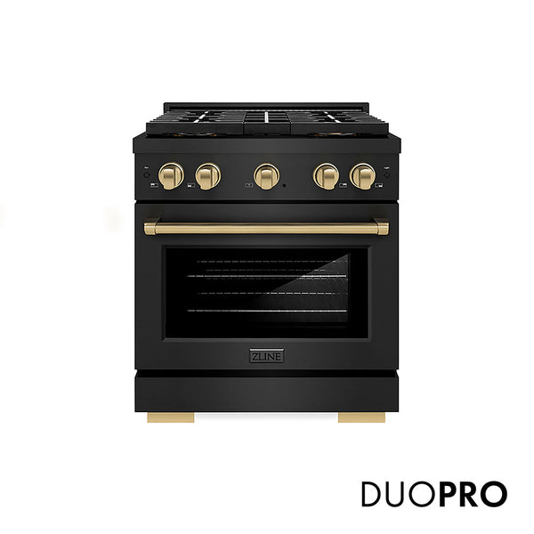 ZLINE Autograph Edition 30 in. 4.2 cu. ft. Paramount Dual Fuel Range with 4 Burner DuoPro™ Cooktop and Electric Convection Oven in Black Stainless Steel and Champagne Bronze Accents (PSDRBZ-30-CB)