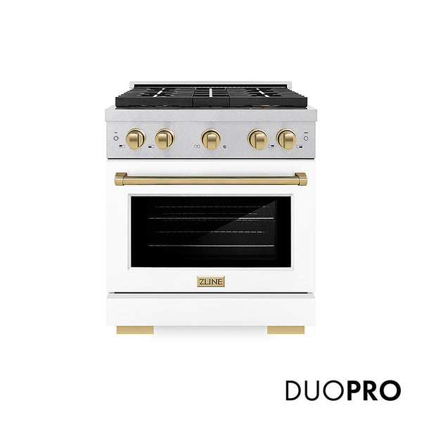 Luxury isn’t meant to be left desired—it’s meant to be attainable. The ZLINE Autograph Edition 30 in. 4.2 cu. ft. Paramount Gas Range with 4 Burner DuoPro™ Cooktop and Convection Gas Oven in Satin Stainless Steel with White Matte Door and Champagne Bronze Accents (PSGRSZ-WM-30-CB) features a high-powered gas cooktop with 4 hand-crafted Italian dual-ring brass burners and a versatile gas convection oven allowing you to master every meal. With ZLINE DuoPro™, every burner brings the performance you need—wherever you need it.