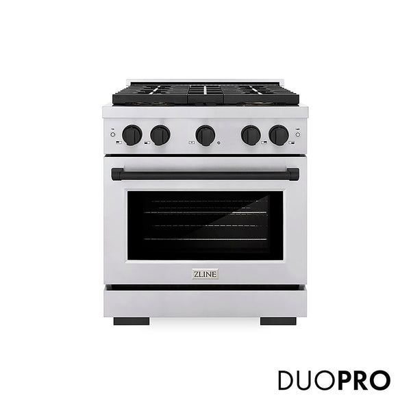 Luxury isn’t meant to be left desired—it’s meant to be attainable. The ZLINE Autograph Edition 30 in. 4.2 cu. ft. Paramount Gas Range with 4 Burner DuoPro™ Cooktop and Convection Gas Oven in Stainless Steel with Matte Black Accents (PSGRZ-30-MB) features a high-powered gas cooktop with 4 hand-crafted Italian dual-ring brass burners and a versatile gas convection oven allowing you to master every meal. With ZLINE DuoPro™, every burner brings the performance you need—wherever you need it.