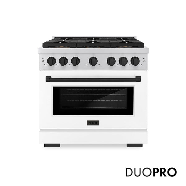 ZLINE Autograph Edition 36 in. 5.2 cu. ft. Paramount Dual Fuel Range with 6 Burner DuoPro™ Cooktop and Electric Convection Oven with White Matte Door and Matte Black Accents (PSDRZ-WM-36-MB)