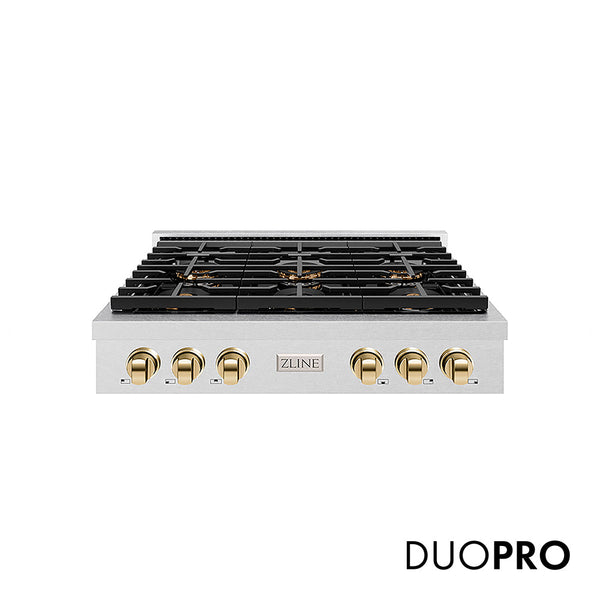 ZLINE Autograph Edition 36 in. Paramount Gas Rangetop with 6 Burner DuoPro™ Cooktop in Satin Stainless Steel and Polished Gold Accents (PSRTSZ-36-G)
