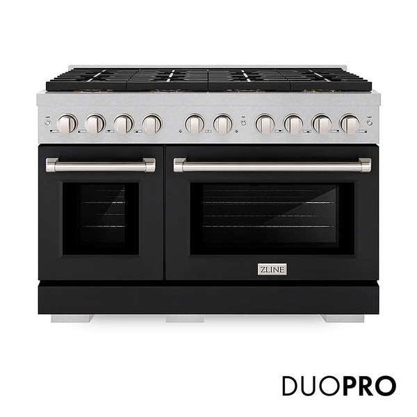Luxury isn’t meant to be left desired—it’s meant to be attainable. The ZLINE 48 in. 6.7 cu. ft. Paramount Gas Range with 8 Burner DuoPro™ Cooktop and Dual Ovens in Satin Stainless Steel with Black Matte Doors (PSGRS-BLM-48) features a high-powered gas cooktop with 8 hand-crafted Italian dual-ring brass burners and a versatile gas convection oven allowing you to master every meal. With ZLINE DuoPro™, every burner brings the performance you need—wherever you need it.