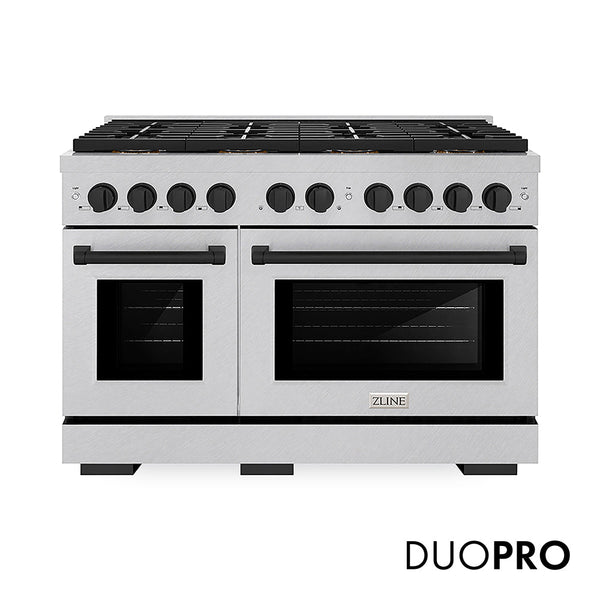 ZLINE Autograph Edition 48 in. 6.7 cu. ft. Paramount Gas Range with 8 Burner DuoPro™ Cooktop and Dual Ovens in Satin Stainless Steel and Matte Black Accents (PSGRSZ-48-MB)