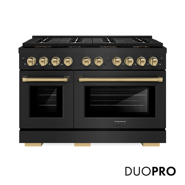 Luxury isn’t meant to be left desired—it’s meant to be attainable. The ZLINE Autograph Edition 48 in. 6.7 cu. ft. Paramount Gas Range with 8 Burner DuoPro™ Cooktop and Dual Ovens in Black Stainless Steel and Champagne Bronze Accents (PSGRBZ-48-CB) features a high-powered gas cooktop with 8 hand-crafted Italian dual-ring brass burners and a versatile gas convection oven allowing you to master every meal. With ZLINE DuoPro™, every burner brings the performance you need—wherever you need it.