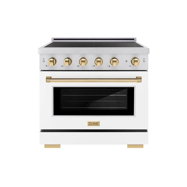 Luxury isn’t meant to be left desired—it’s meant to be attainable. The ZLINE Autograph Edition 36 in. 5.2 cu. ft. Paramount Induction Range with 5 Element Cooktop and Electric Convection Oven in Satin Stainless Steel with White Matte Door and Polished Gold Accents (SINRSZ-WM-36-G) combines the versatility of a nanotechnology-reinforced anti-scratch cooktop with anti-glare coating, an electric convection oven with digital thermostat technology, and a Horizon oven door window design allowing you to master every meal. With a modern, timeless style and refined functionality, ZLINE Paramount Induction Ranges are masterfully crafted to deliver an elevated culinary experience.
