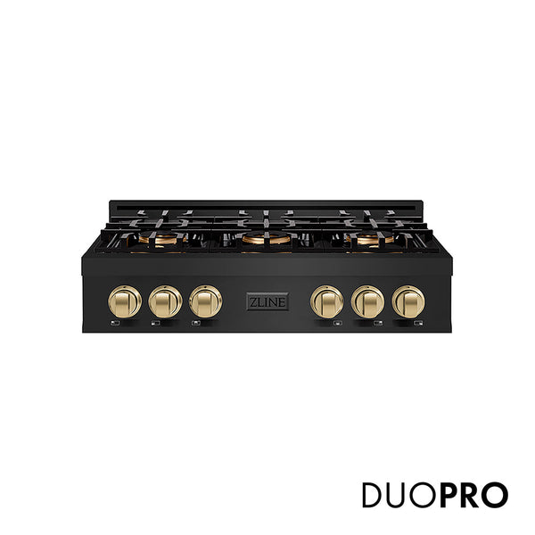 Luxury isn’t meant to be left desired—it’s meant to be attainable. The ZLINE Autograph Edition 36 in. Classic Gas Rangetop with 6 Burner DuoPro™ Cooktop in Black Stainless Steel and Champagne Bronze Accents (PCRTBZ-36-CB) features a high-powered gas cooktop with 6 hand-crafted Italian dual-ring brass burners and an expansive one-piece porcelain cooktop allowing you to master every meal. With ZLINE DuoPro™, every burner brings the performance you need—wherever you need it.