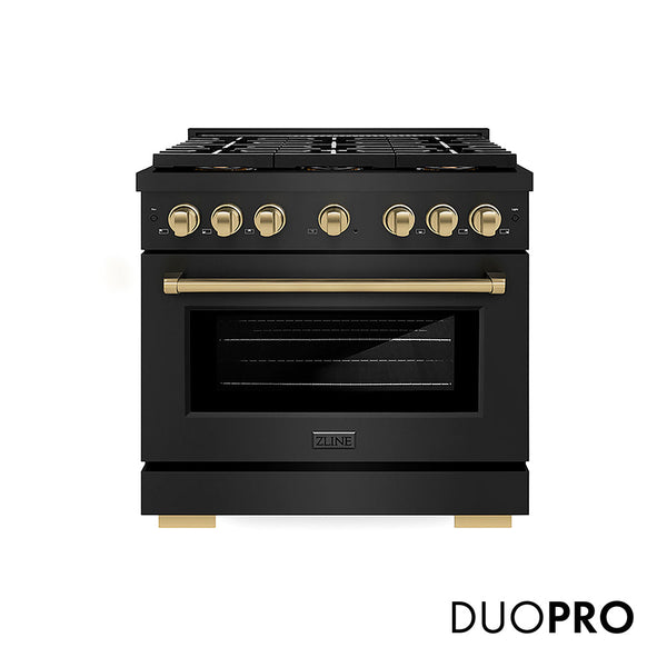 Luxury isn’t meant to be left desired—it’s meant to be attainable. The ZLINE Autograph Edition 36 in. 5.2 cu. ft. Paramount Dual Fuel Range with 6 Burner DuoPro™ Cooktop and Electric Convection Oven in Black Stainless Steel and Champagne Bronze Accents (PSDRBZ-36-CB) features a high-powered gas cooktop with 6 hand-crafted Italian dual-ring brass burners and a versatile electric convection oven allowing you to master every meal. With ZLINE DuoPro™, every burner brings the performance you need—wherever you need it.