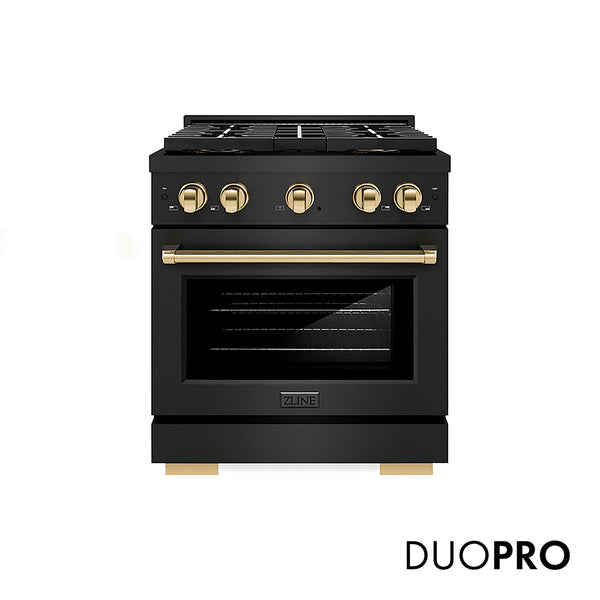 Luxury isn’t meant to be left desired—it’s meant to be attainable. The ZLINE Autograph Edition 30 in. 4.2 cu. ft. Paramount Dual Fuel Range with 4 Burner DuoPro™ Cooktop and Electric Convection Oven in Black Stainless Steel and Polished Gold Accents (PSDRBZ-30-G) features a high-powered gas cooktop with 4 hand-crafted Italian dual-ring brass burners and a versatile electric convection oven allowing you to master every meal. With ZLINE DuoPro™, every burner brings the performance you need—wherever you need it.
