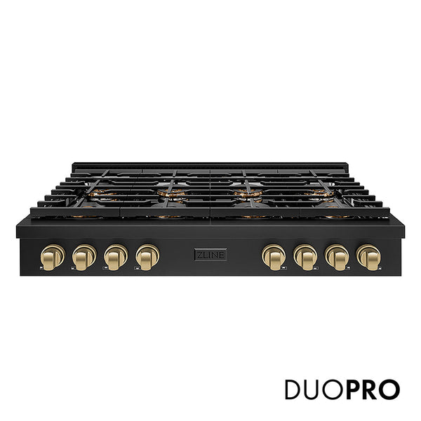 Luxury isn’t meant to be left desired—it’s meant to be attainable. The ZLINE Autograph Edition 48 in. Paramount Gas Rangetop with 8 Burner DuoPro™ Cooktop in Black Stainless Steel and Polished Gold Accents (PSRTBZ-48-G) features a high-powered gas cooktop with 6 hand-crafted Italian dual-ring brass burners and an expansive one-piece porcelain cooktop allowing you to master every meal. With ZLINE DuoPro™, every burner brings the performance you need—wherever you need it.